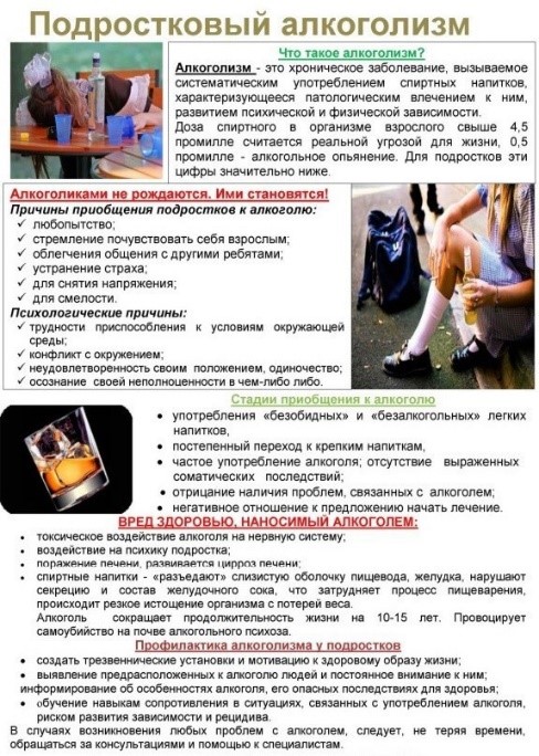 При воздействии алкоголя поражаются практически все системы организма подростка. Согласно статистике, 5-7% отравлений у детей приходится на долю алкогольных интоксикаций. Явления опьянения у детей и подростков развиваются быстро и могут завершиться комой. Артериальное давление и температура тела повышаются, уровень глюкозы в крови, количество лейкоцитов падает. Кратковременное возбуждение, вызванное приемом алкоголя, быстро переходит в глубокий интоксикационный сон, нередки судороги, даже летальный исход. Иногда регистрируют психические нарушения с бредом и галлюцинациями.