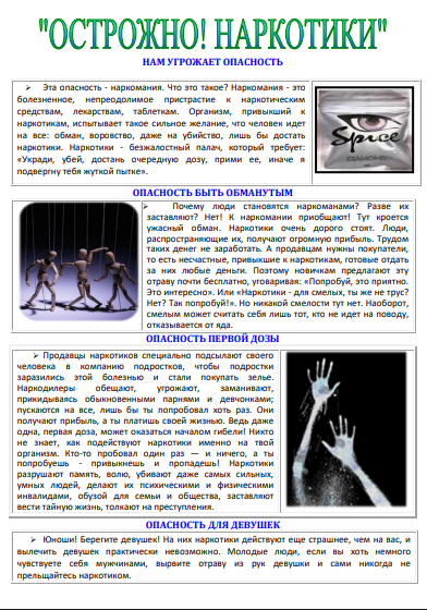 В последнее время каждый ребенок может получить предложение их попробовать, как раньше табак или алкоголь. Зависимость от наркотиков формируется очень быстро, иногда после нескольких употреблений. Наркомания — это болезнь, распространяющаяся со скоростью эпидемии и уносящая жизни детей с неотвратимостью, присущей СПИДу.